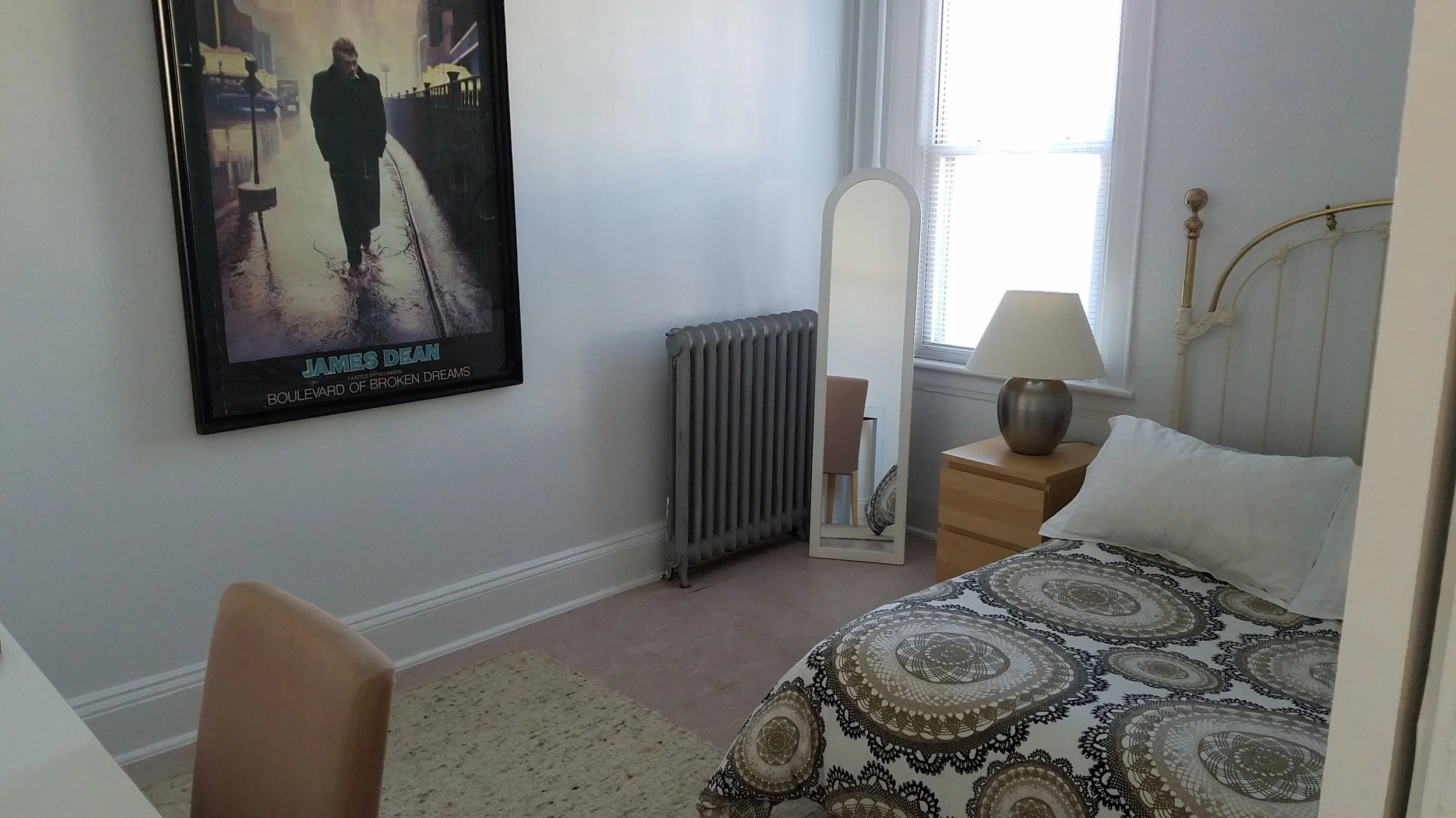 fully renovated bathroom with modern vertical porcelain tile, salvaged existing tub by reglazing surface, and refurbished sink/mirror cabinets