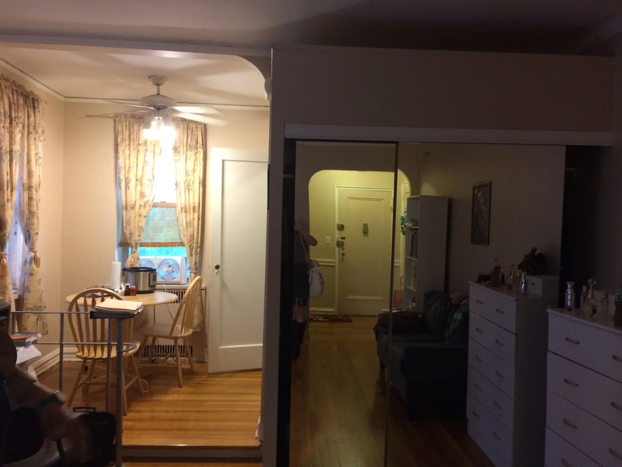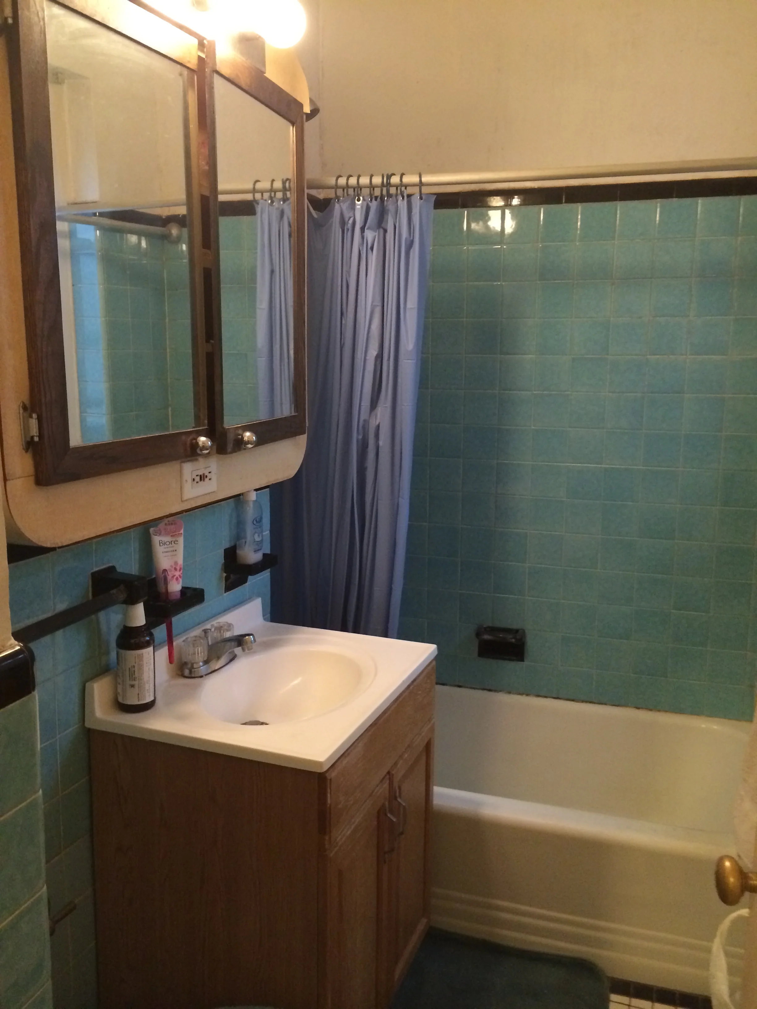 bathroom received a makeover repurposing the existing tile, but added a modern vanity, modern wall to wall mirror medicine cabinet and a glass shower enclosure